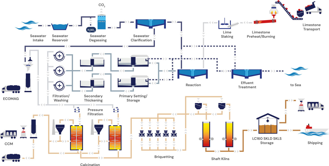 The two main raw materials are seawater and limestone (Calcium Carbonate, CaCO3). There is also significant energy input into the process in the form of Natural Gas, Petroleum Coke and Electricity.